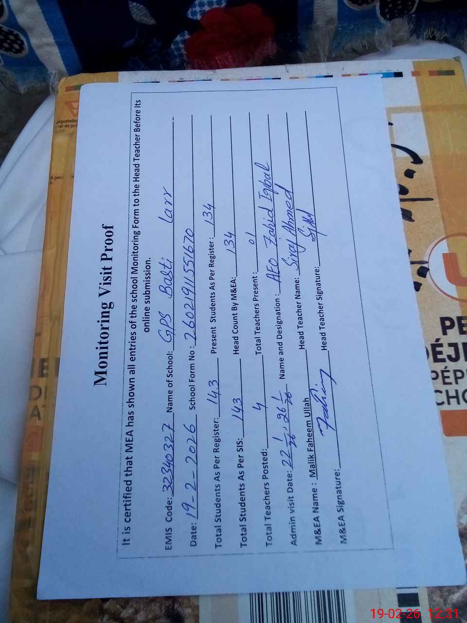 | Attendance Register | Head Teacher | MEA with School | Visit Proof |