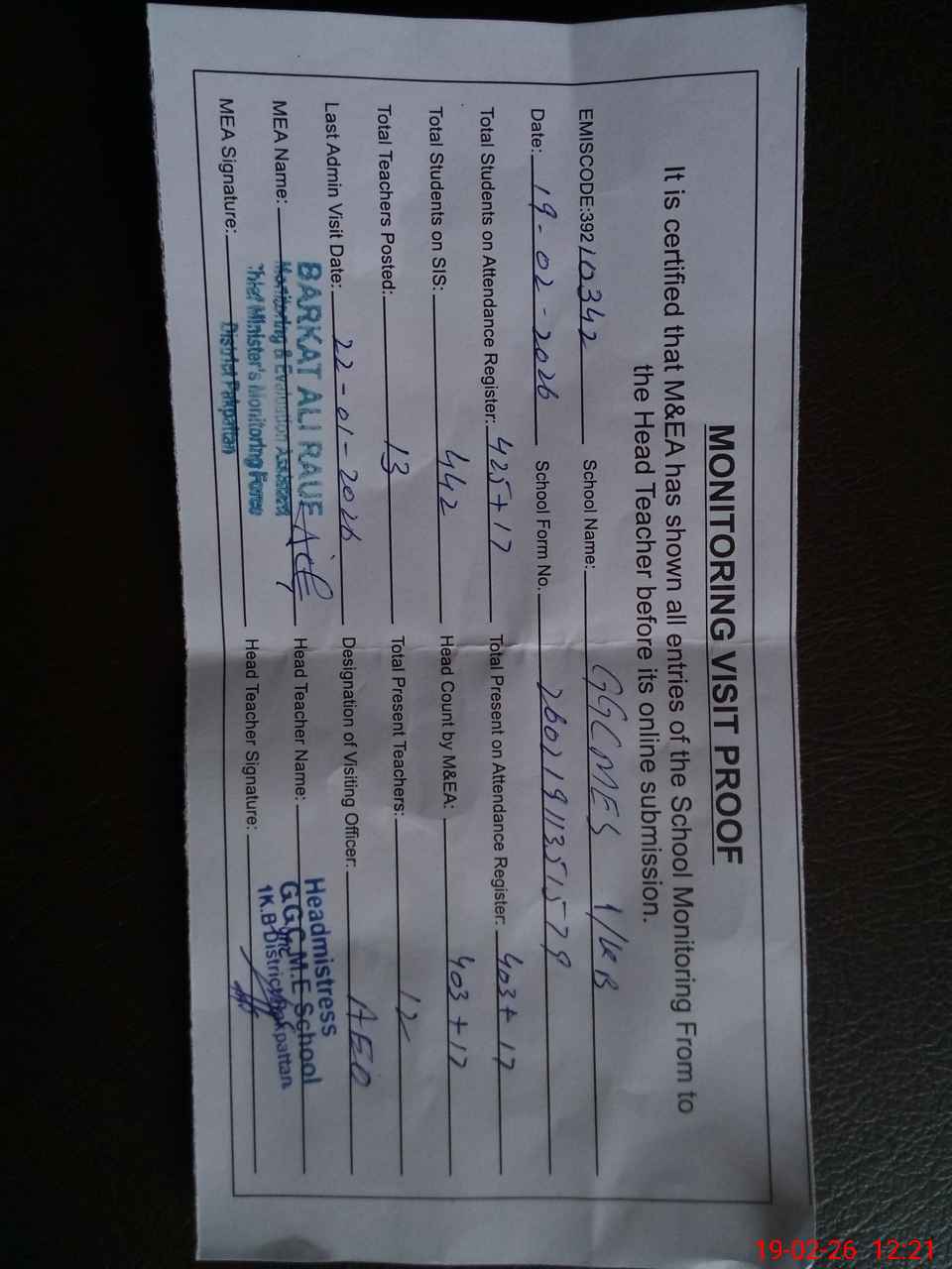 | Attendance Register | Head Teacher | MEA with School | Visit Proof |