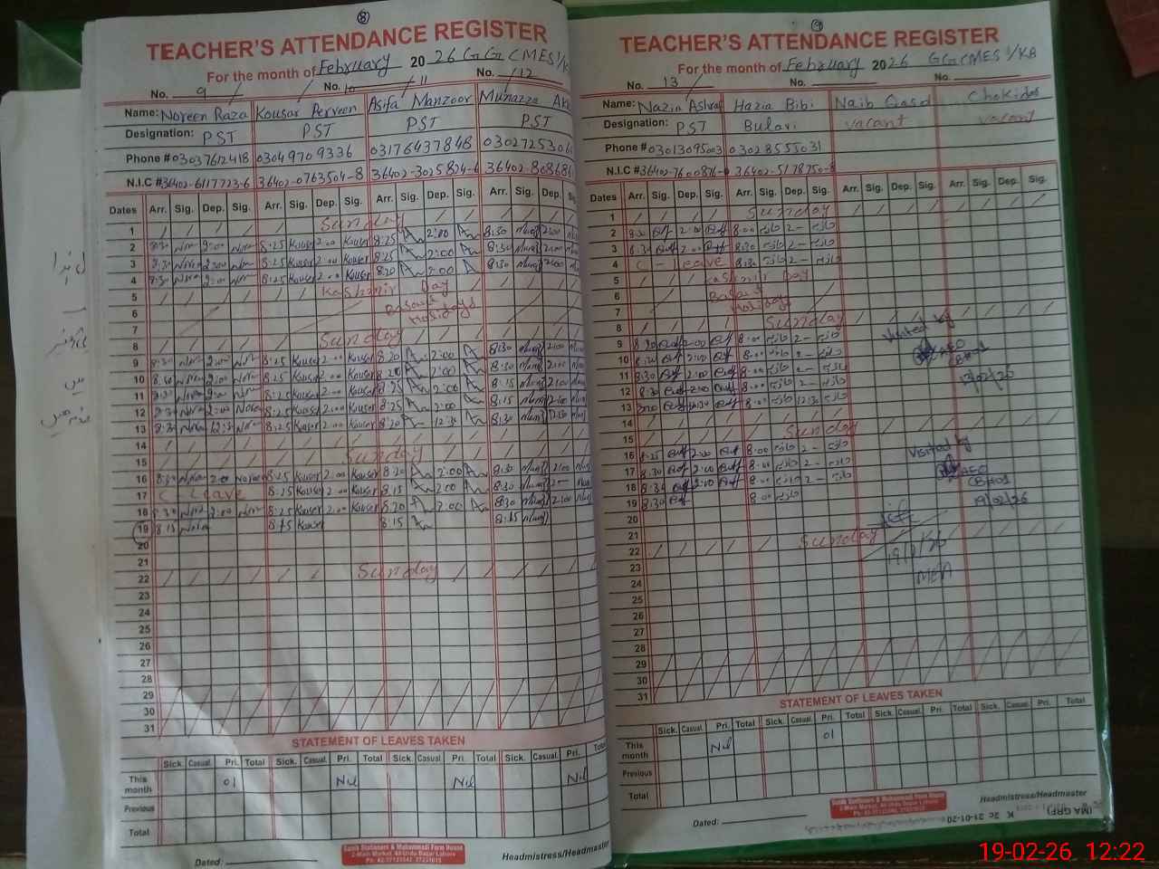 | CNIC | Full Name | Designation | R/C | Absence During Last Calender Month |