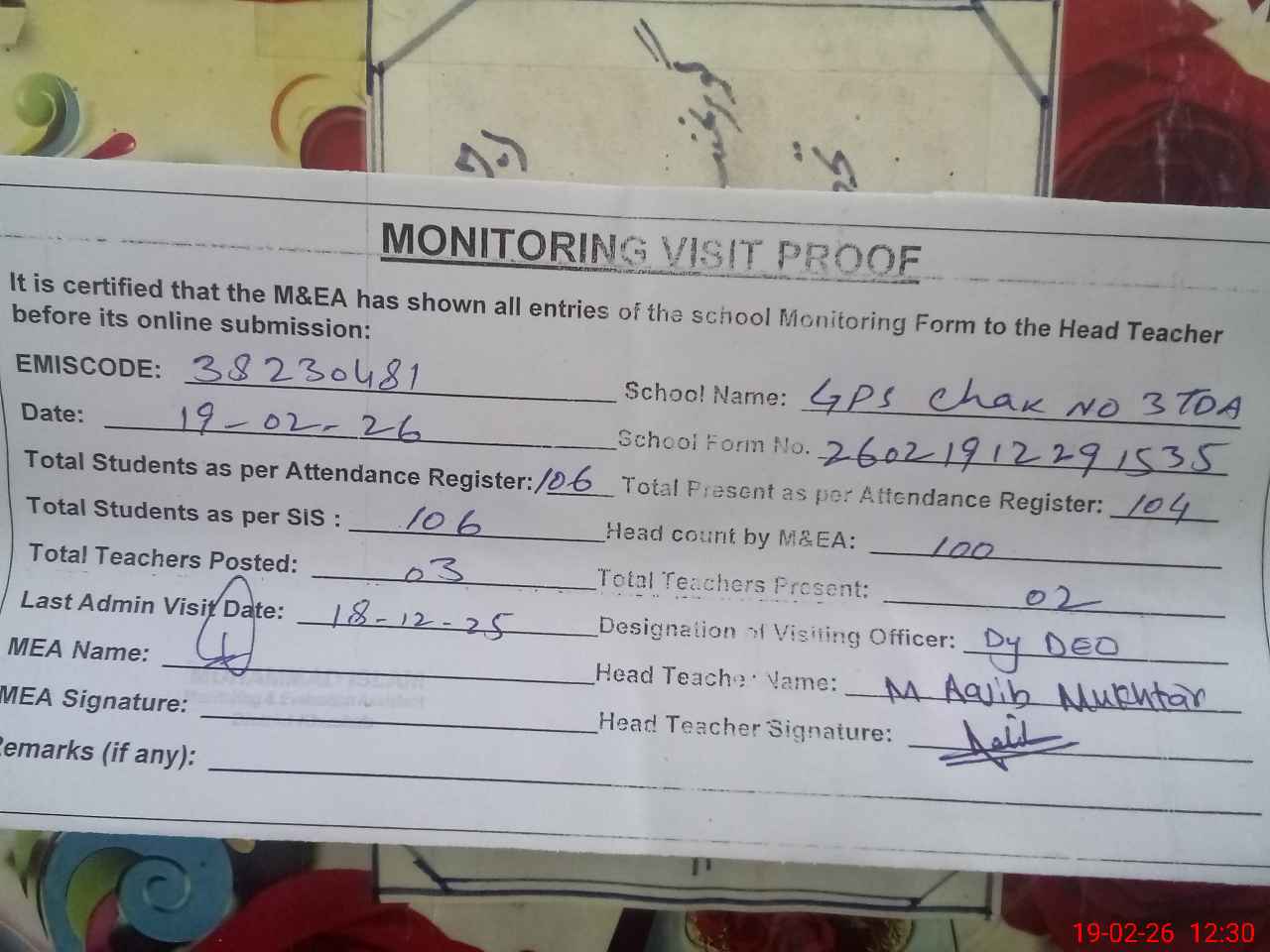 | EMIS Code: 38230481 | Name of School: GPS CHAK NO 3 TDA | |||