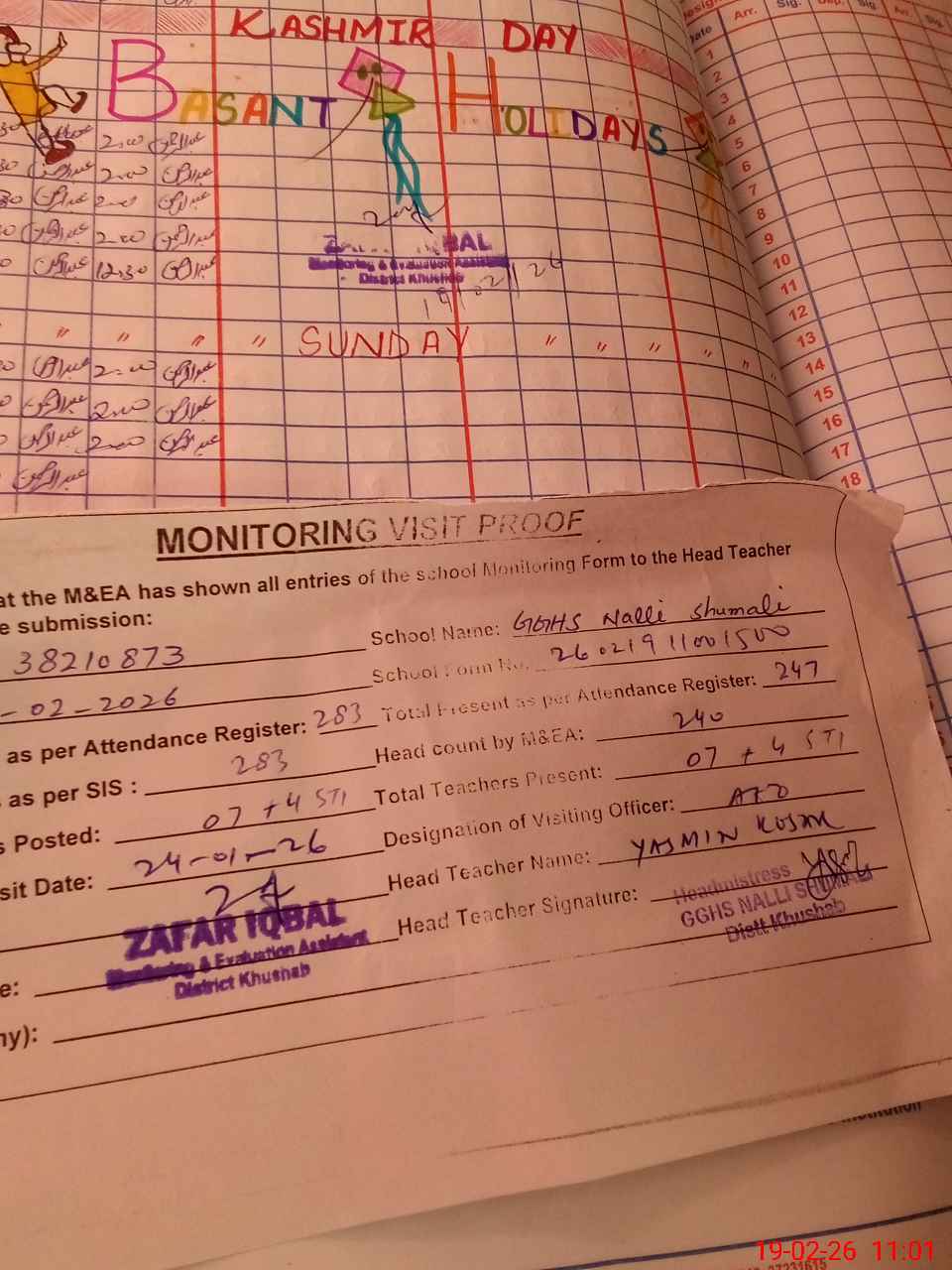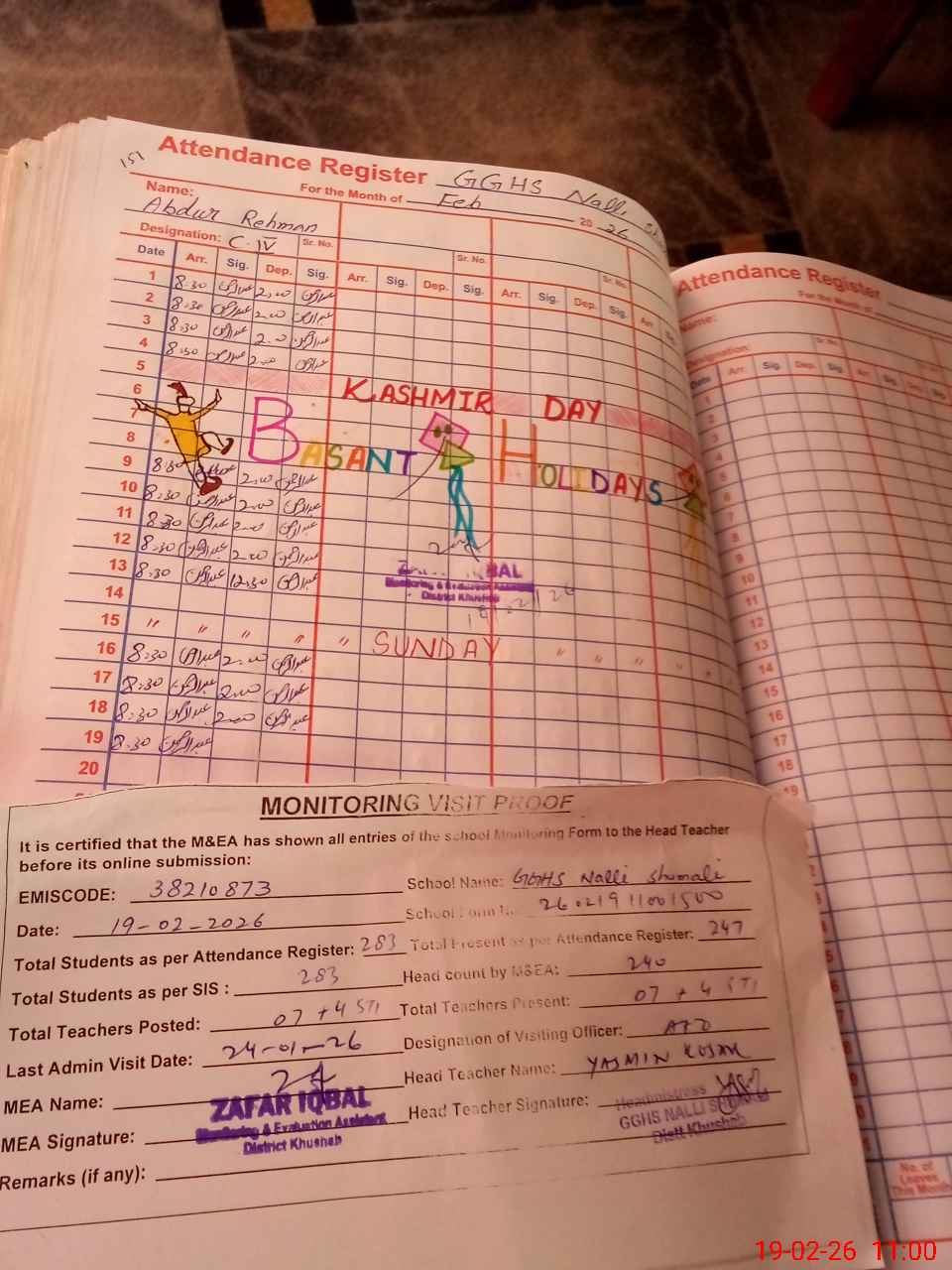 | Attendance Register | Head Teacher | MEA with School | Visit Proof |