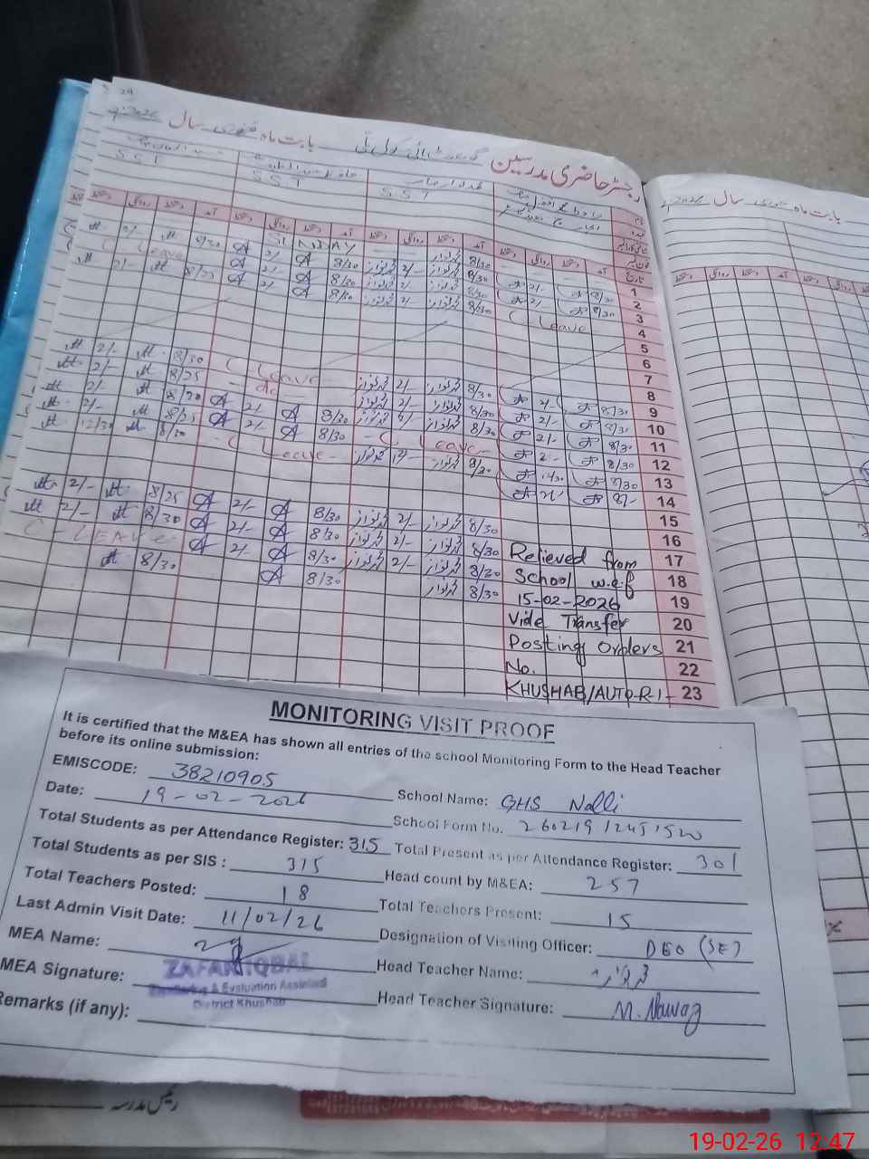 | Remarks (Use Separate Page if Required): last visit DEO Secondary on 11 Feb 26 Total on sis 315 Total on register 315 | |||||