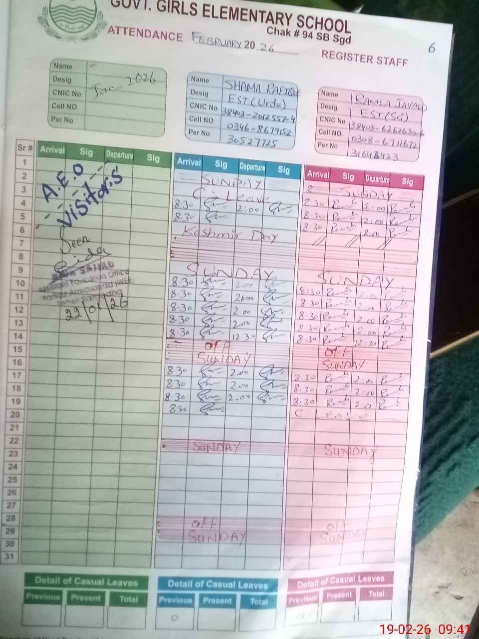 | CNIC | Full Name | Designation | R/C | Absence during last cal. month |