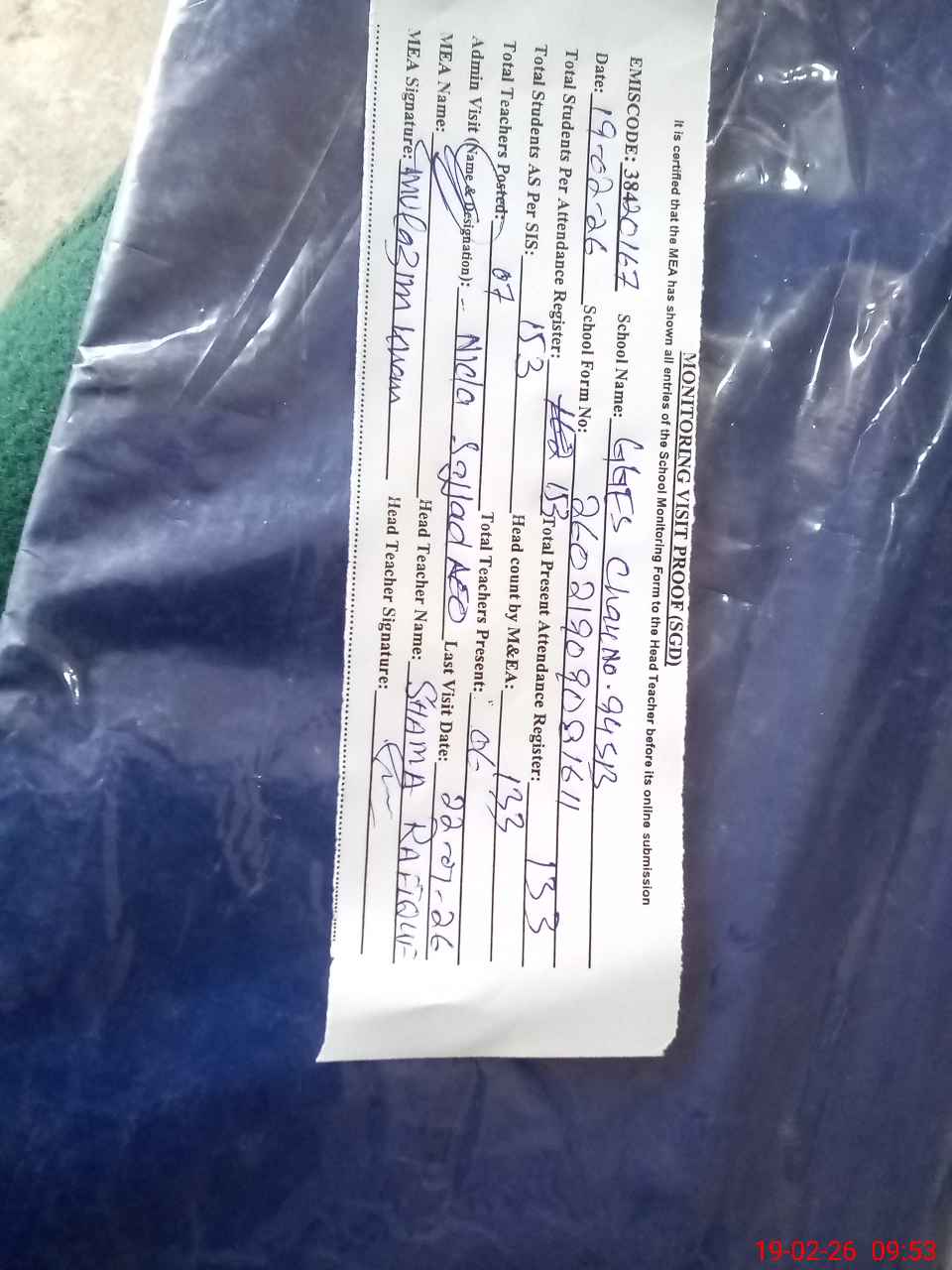 | Attendance Register | Head Teacher | MEA with School | Visit Proof |