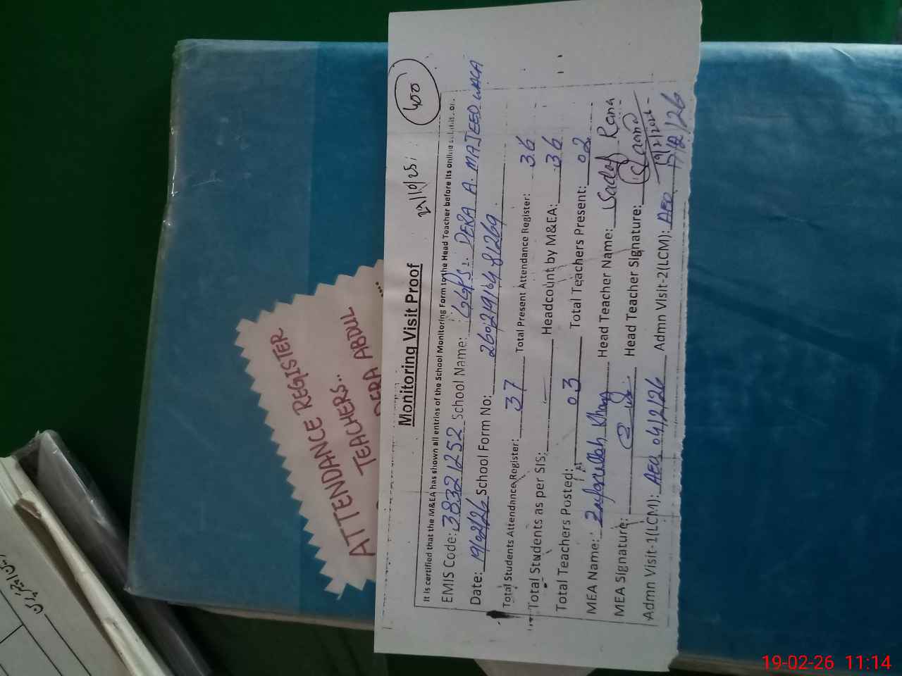| Attendance Register | Head Teacher | MEA with School | Visit Proof |