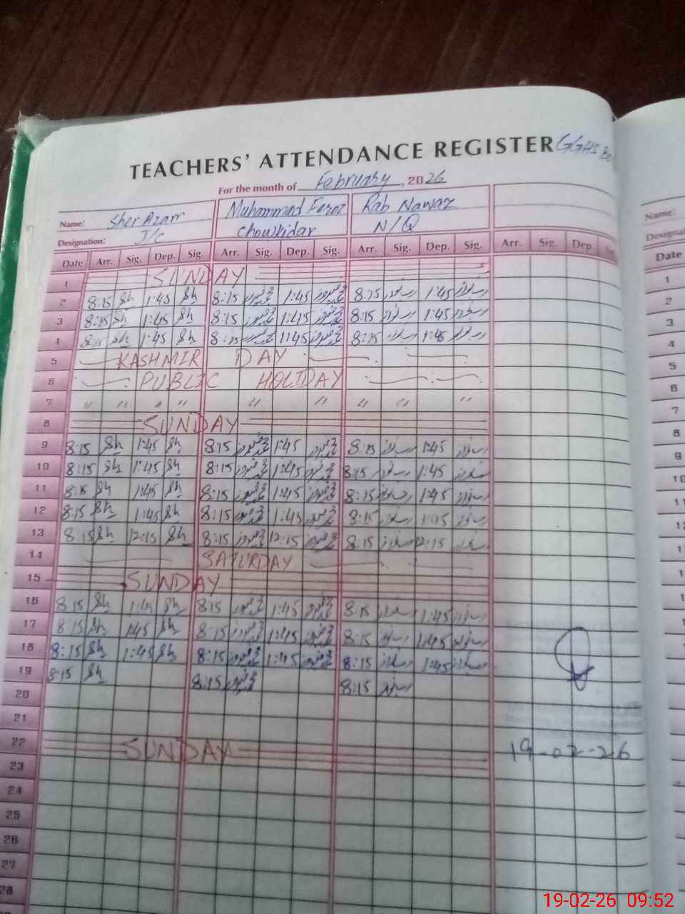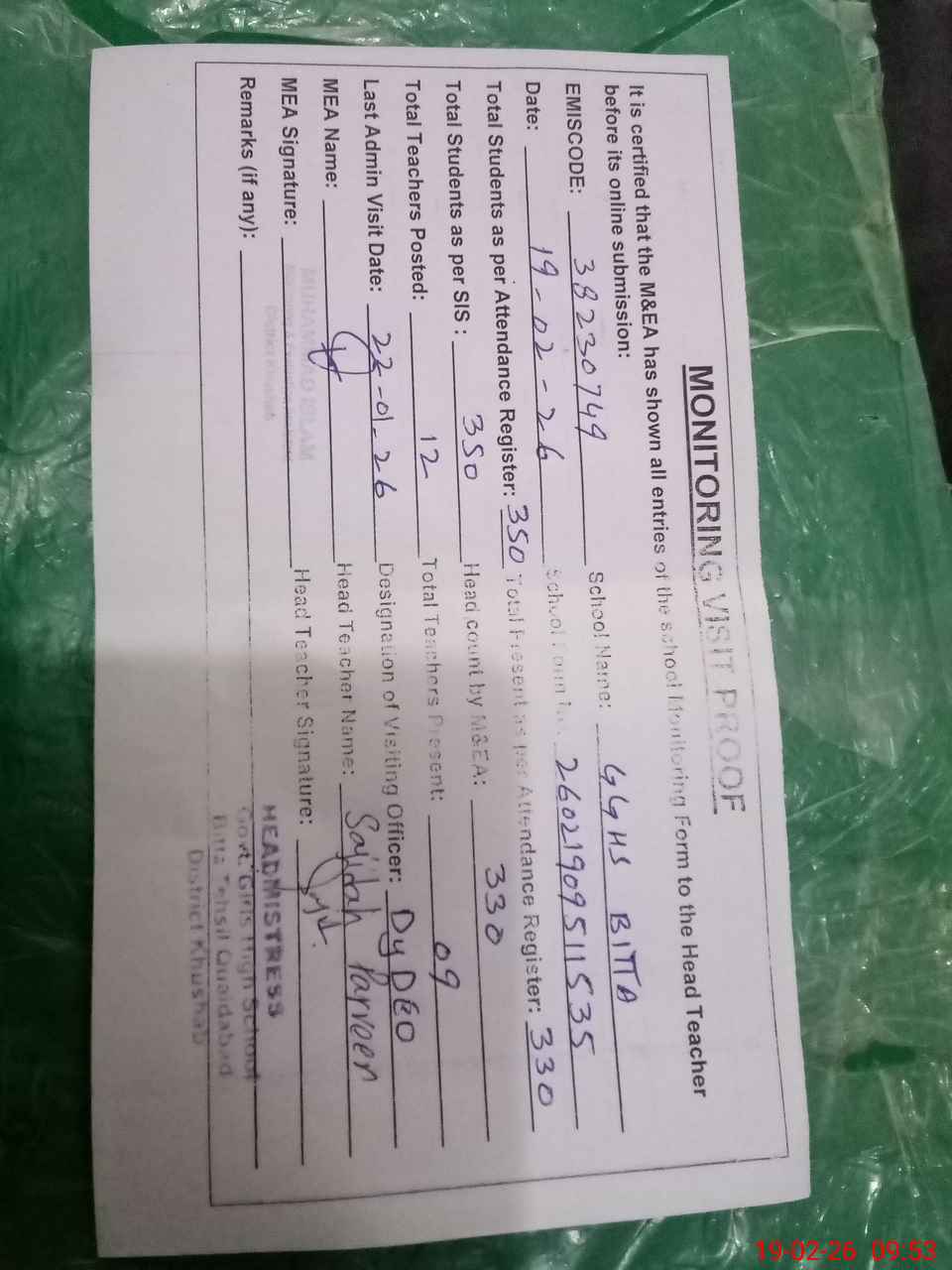 | Remarks (Use Separate Page if Required): Dy DEO visited school on 22 January 2026 students strength on sis 350 | |||||
