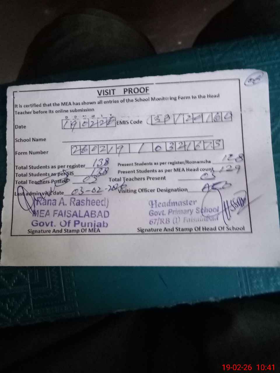 | Certified that this School was Inspected by the Undersigned MEA/DMO Today and the Information Stated Above is as Per Record. | |||||