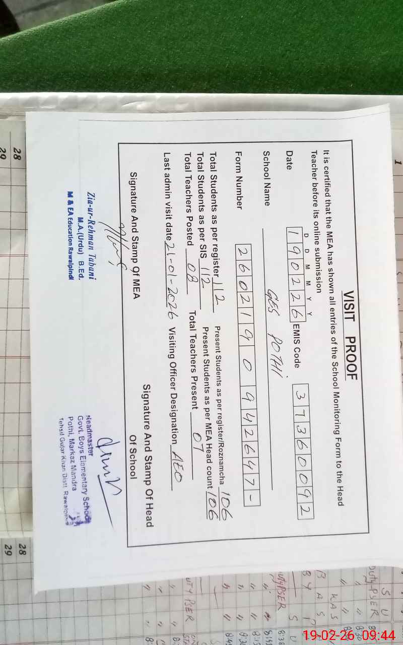 | Certified that this School was Inspected by the Undersigned MEA/DMO Today and the Information Stated Above is as Per Record. | |||||