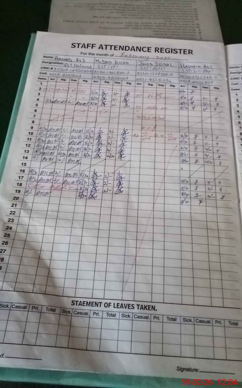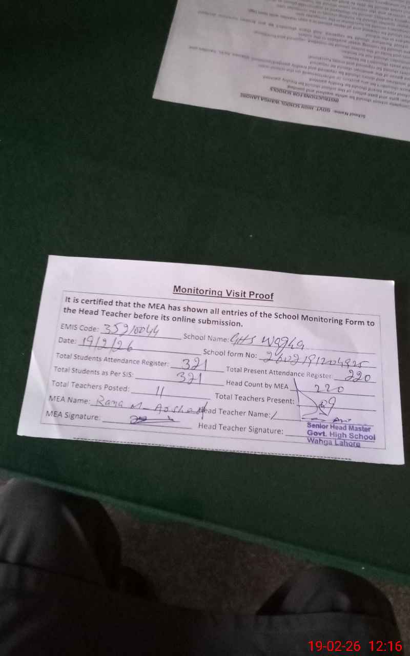 | Remarks (Use Separate Page if Required): Teacher Asad Aftab PST on Casual leave from 04 Days but his sanctioned casual leave was not available on line so according to monitoring sop mark him Absent. JC M Faheem Suspended by CEO DEA Lahore. | |||||