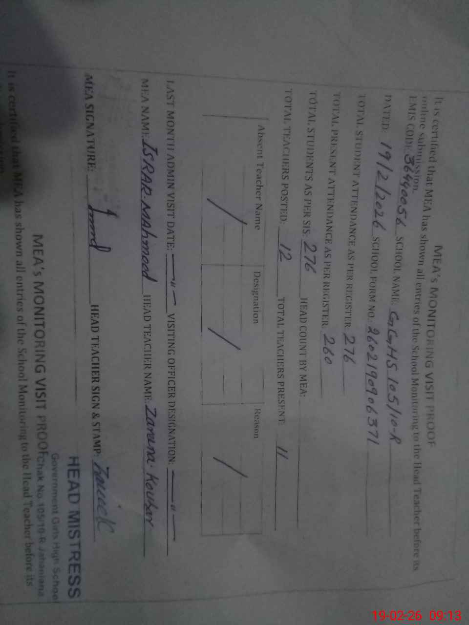 | EMIS Code: 36440056 | Name of School: GGHS 105/10-R, JAHANIAN | |||