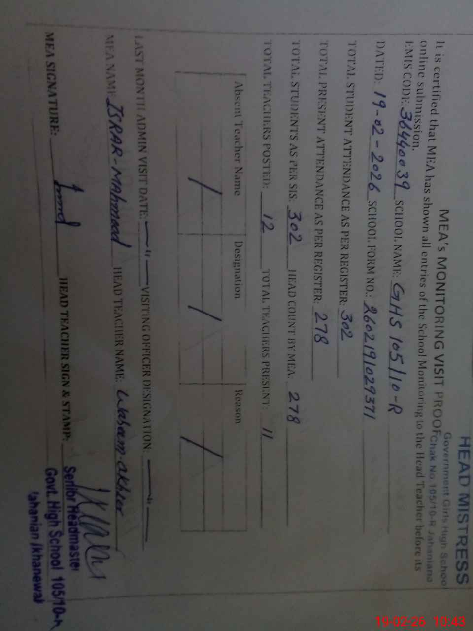 | EMIS Code: 36440039 | Name of School: GHS 105/10-R, JAHANIAN | |||