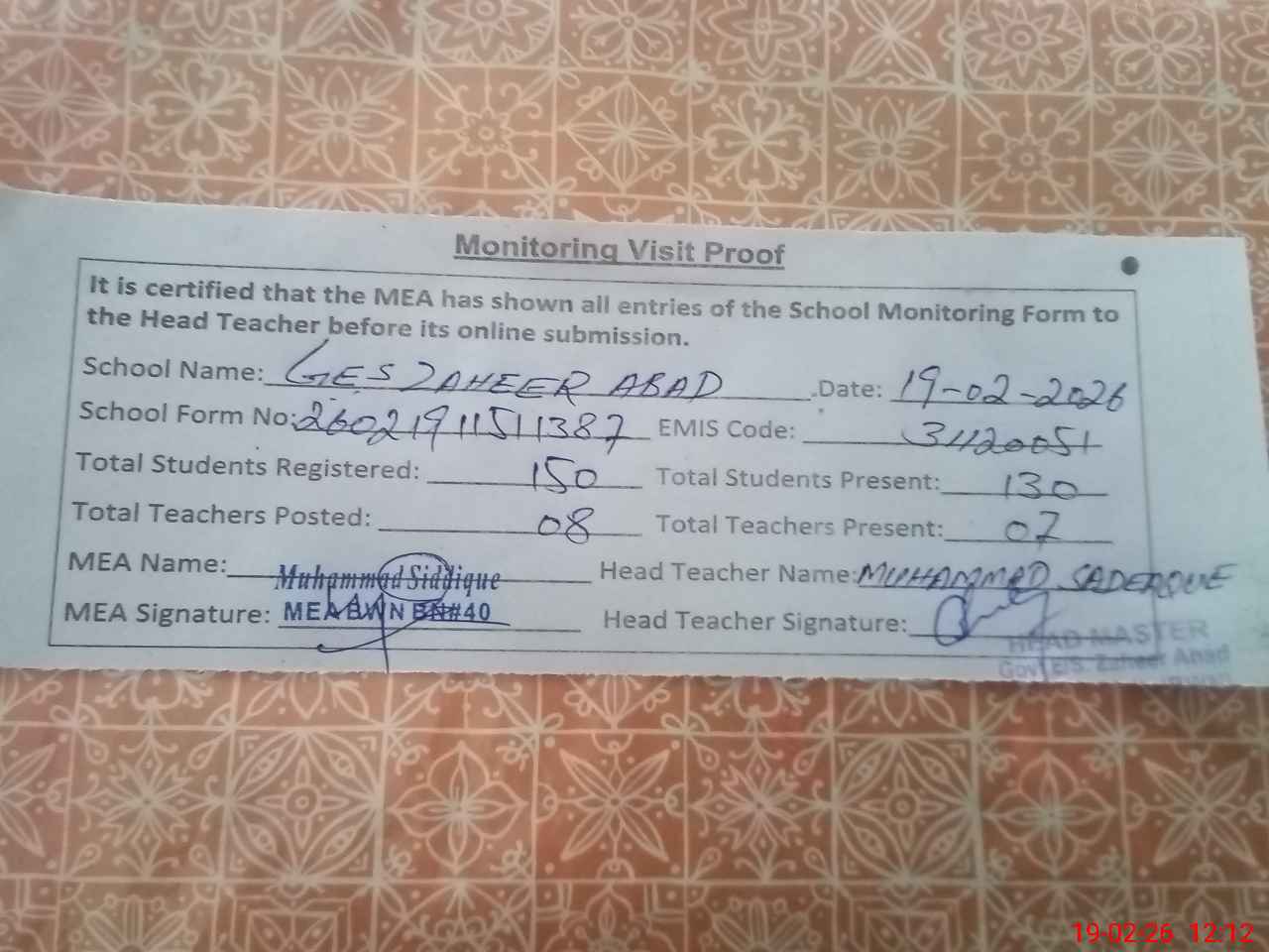 | Attendance Register | Head Teacher | MEA with School | Visit Proof |