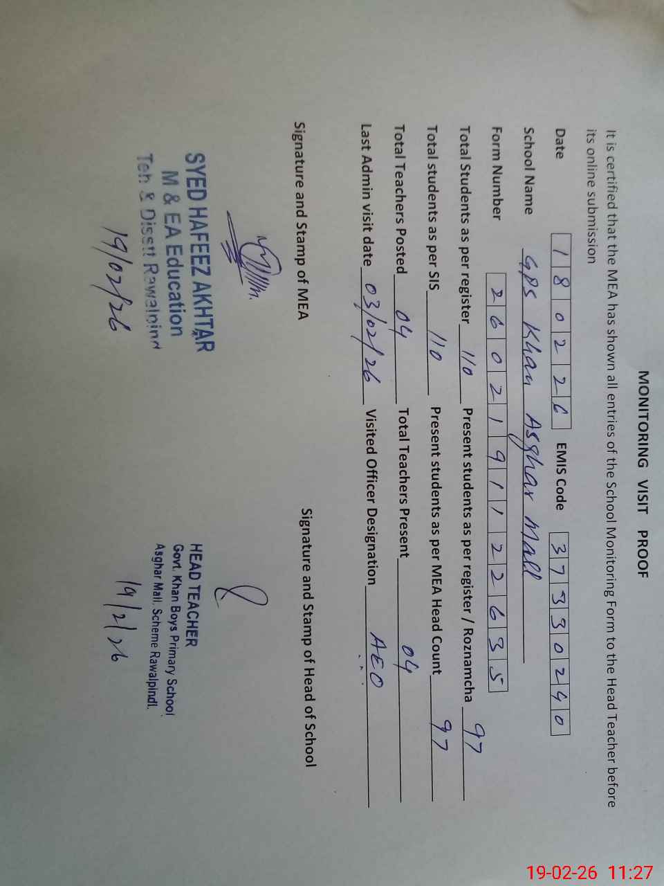 | EMIS Code: 37330240 | Name of School: GPS KHAN ASGHAR MALL | |||