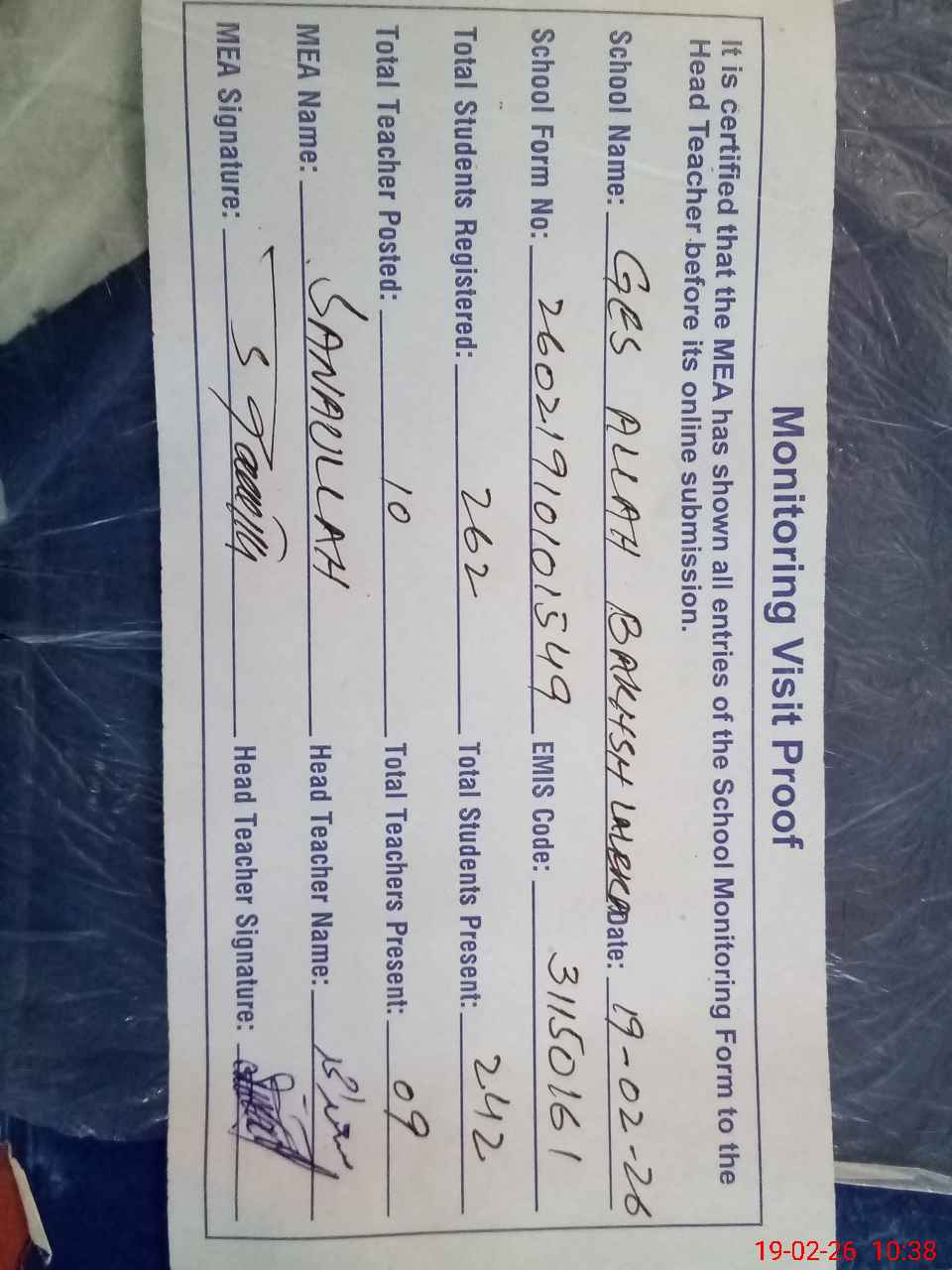| Certified that this School was Inspected by the Undersigned MEA/DMO Today and the Information Stated Above is as Per Record. | |||||