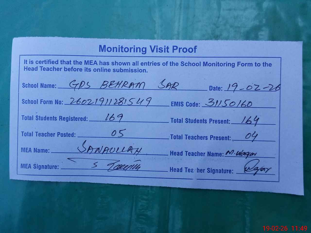 | Attendance Register | Head Teacher | MEA with School | Visit Proof |