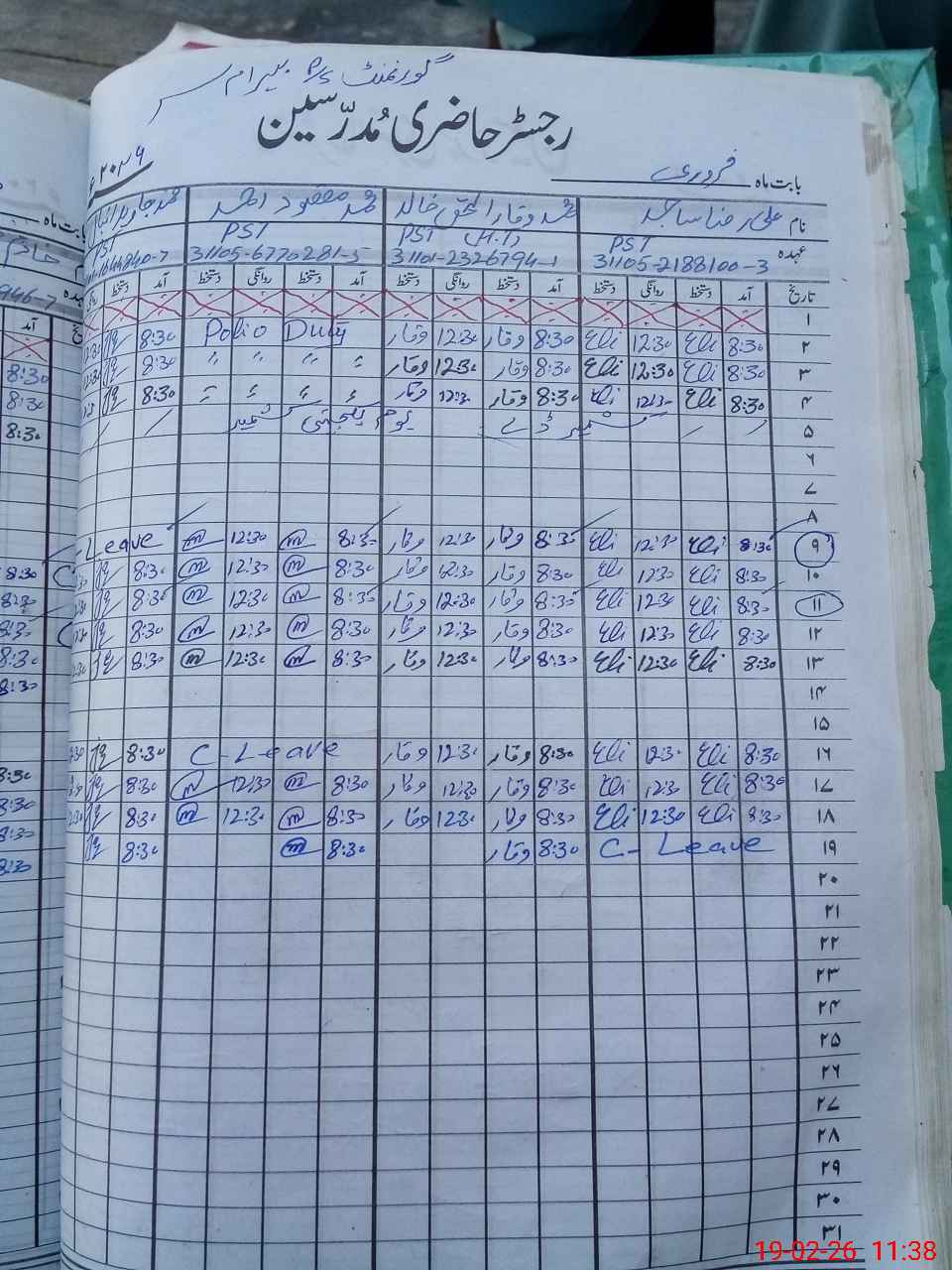 | CNIC | Full Name | Designation | R/C | Absence During Last Calender Month |