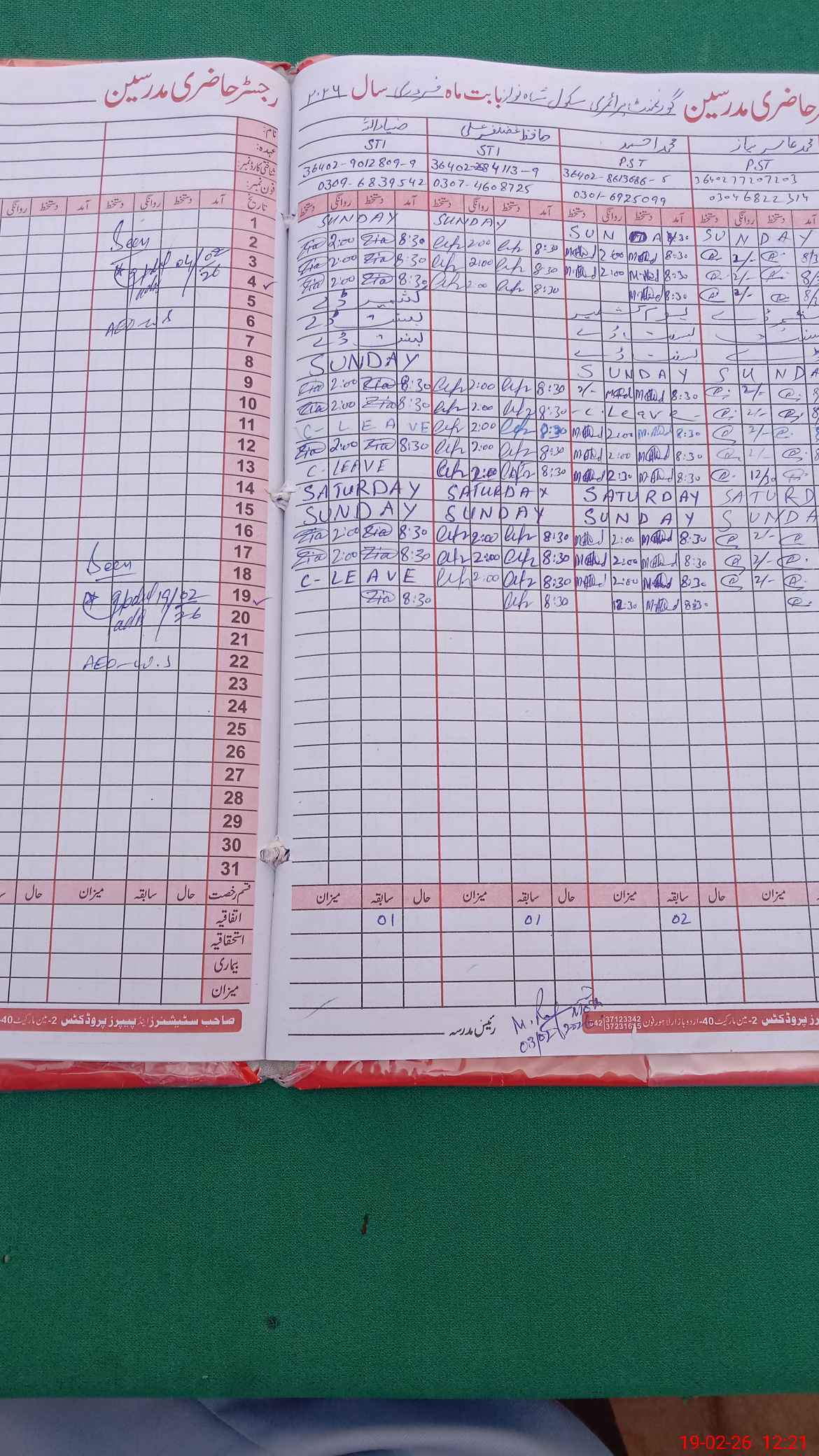 | Leave | Duty | Absent | Maternity | Medical | Ex- Pak |