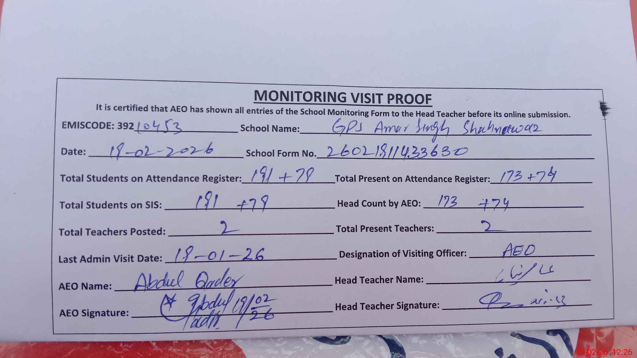 | EMIS Code: 39210453 | Name of School: GPS AMAR SINGH P/O 26/S.P PAKPATTAN | |||