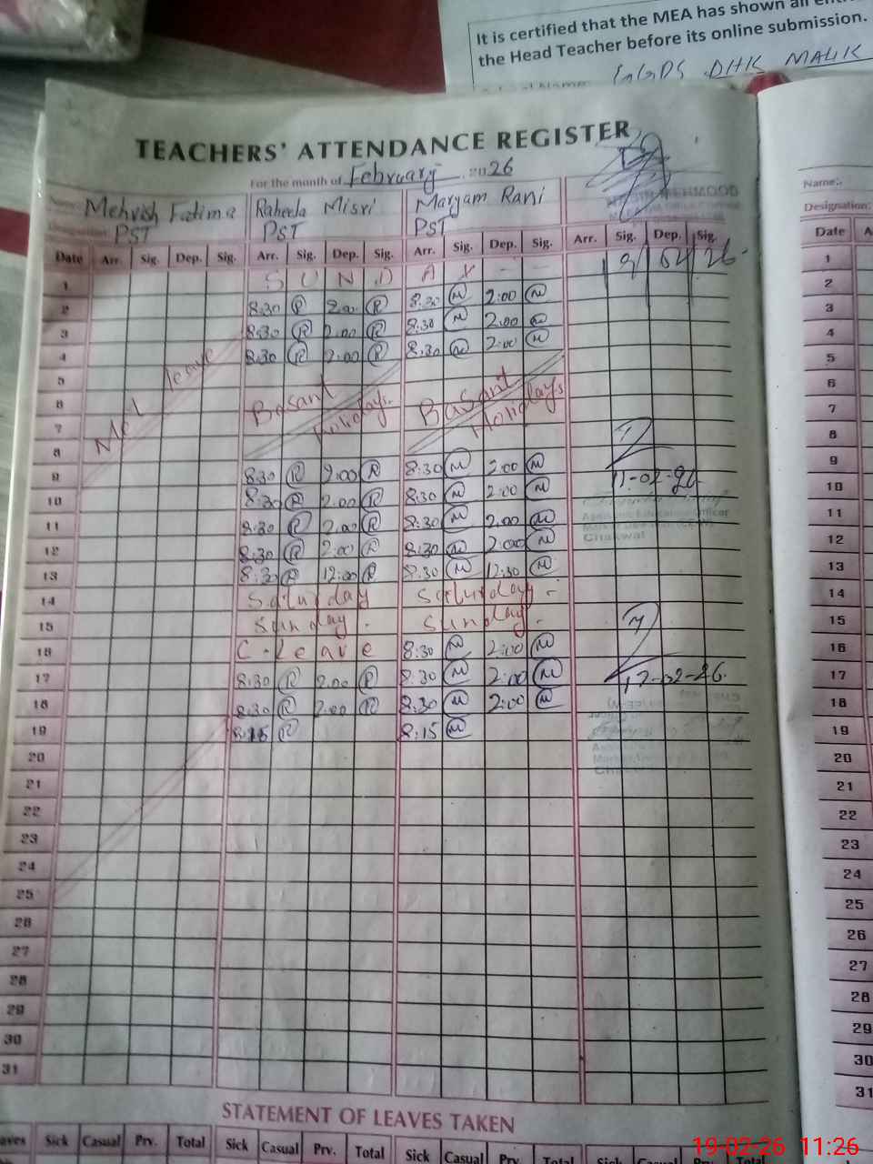 | Attendance Register | Head Teacher | MEA with School | Visit Proof |