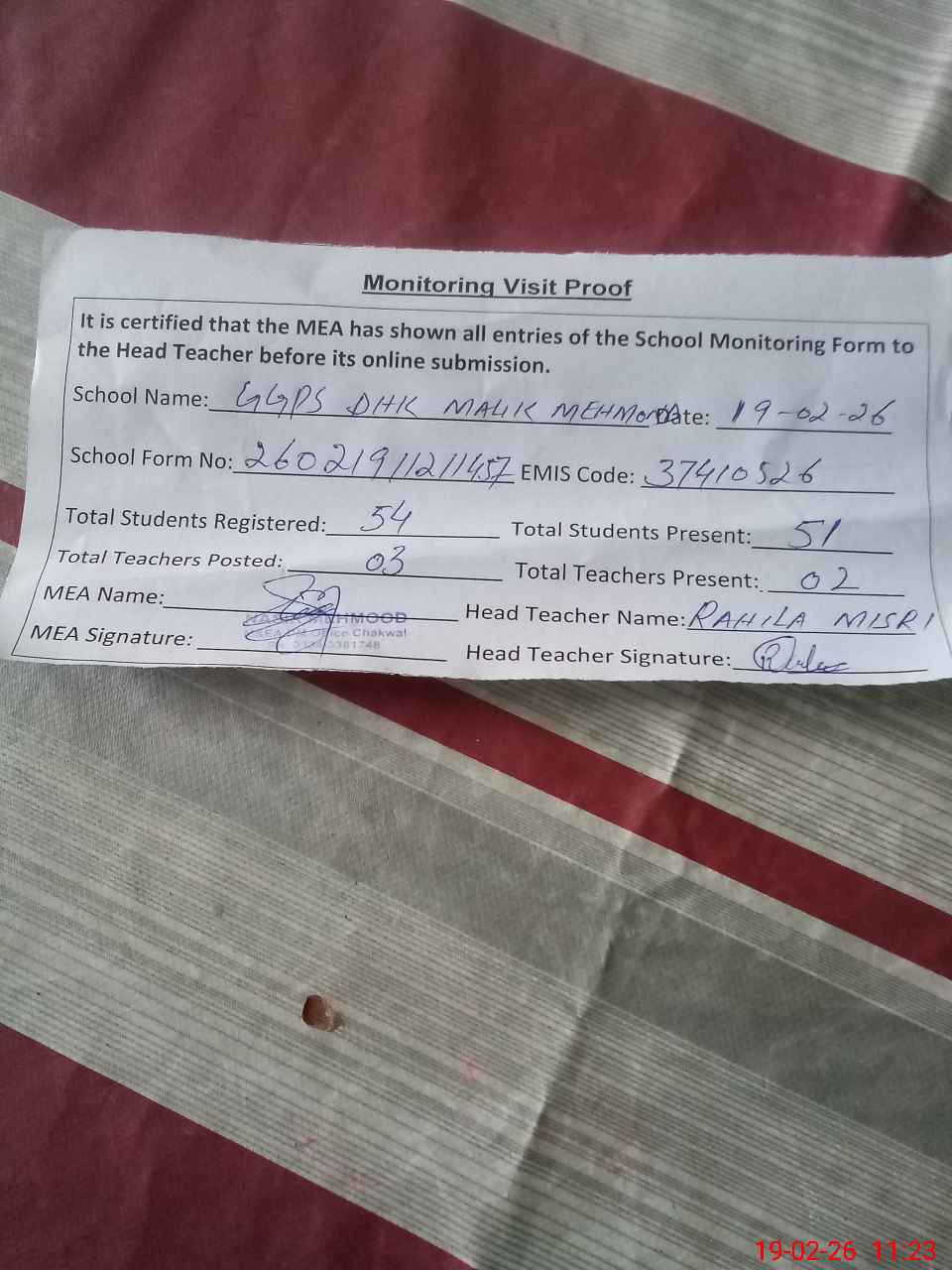 | Certified that this School was Inspected by the Undersigned MEA/DMO Today and the Information Stated Above is as Per Record. | |||||