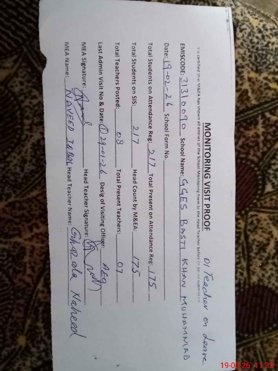 | Attendance Register | Head Teacher | MEA with School | Visit Proof |