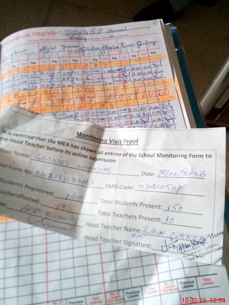 | Attendance Register | Head Teacher | MEA with School | Visit Proof |