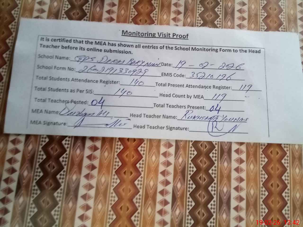 | Attendance Register | Head Teacher | MEA with School | Visit Proof |