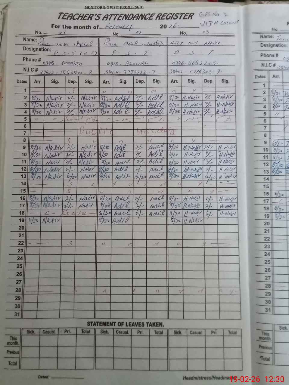 | Name: NA**** IQ**** Designation: (School Headmaster's/Headmistress's) PST Phone/Cell Number: 03**** |