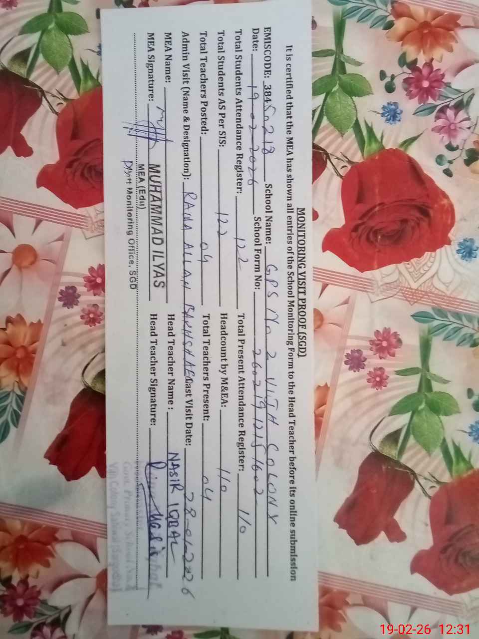 | Attendance Register | Head Teacher | MEA with School | Visit Proof |