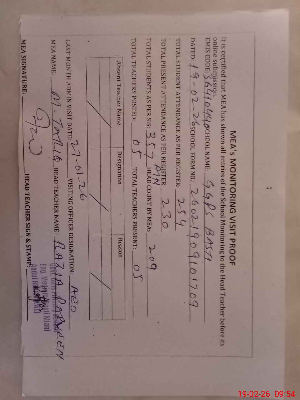 | Attendance Register | Head Teacher | MEA with School | Visit Proof |