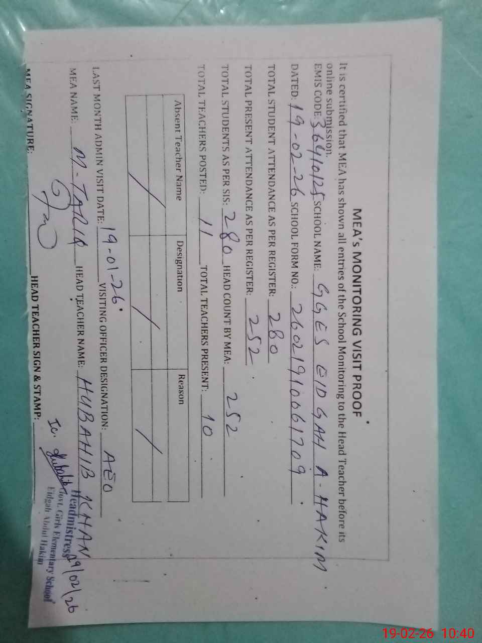 | Attendance Register | Head Teacher | MEA with School | Visit Proof |