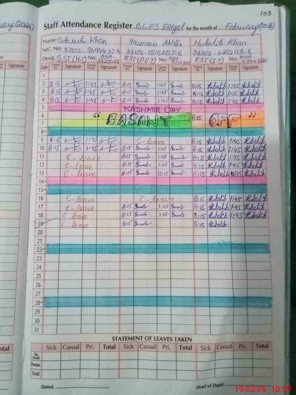 | CNIC | Full Name | Designation | R/C | Absence During Last Calender Month |