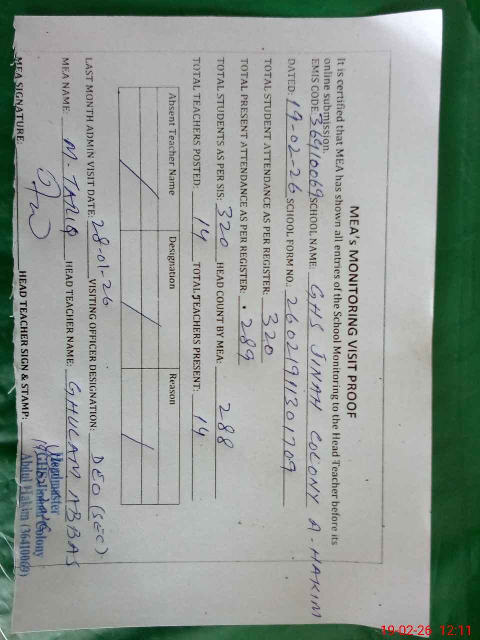 | Attendance Register | Head Teacher | MEA with School | Visit Proof |