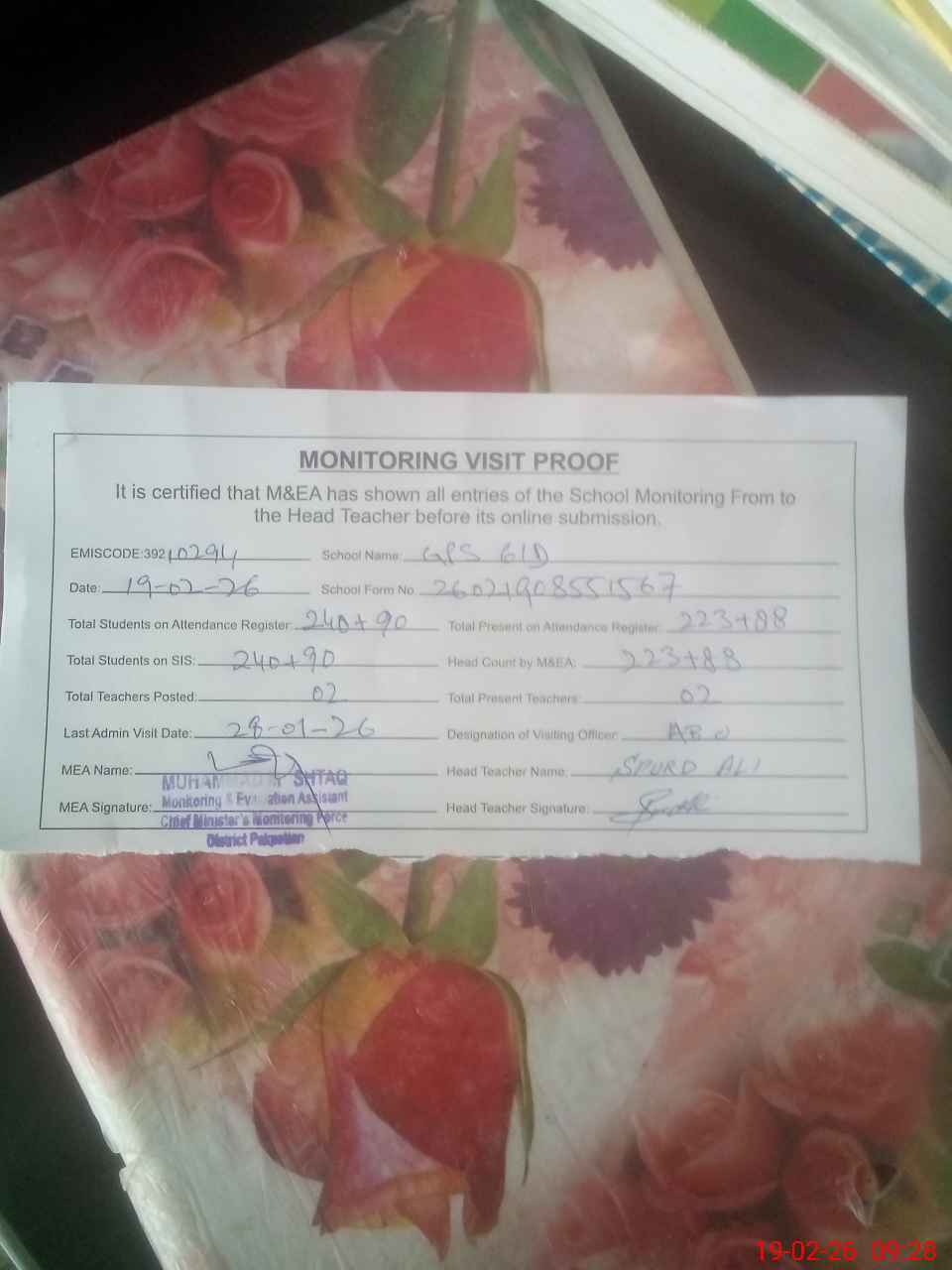 | Attendance Register | Head Teacher | MEA with School | Visit Proof |