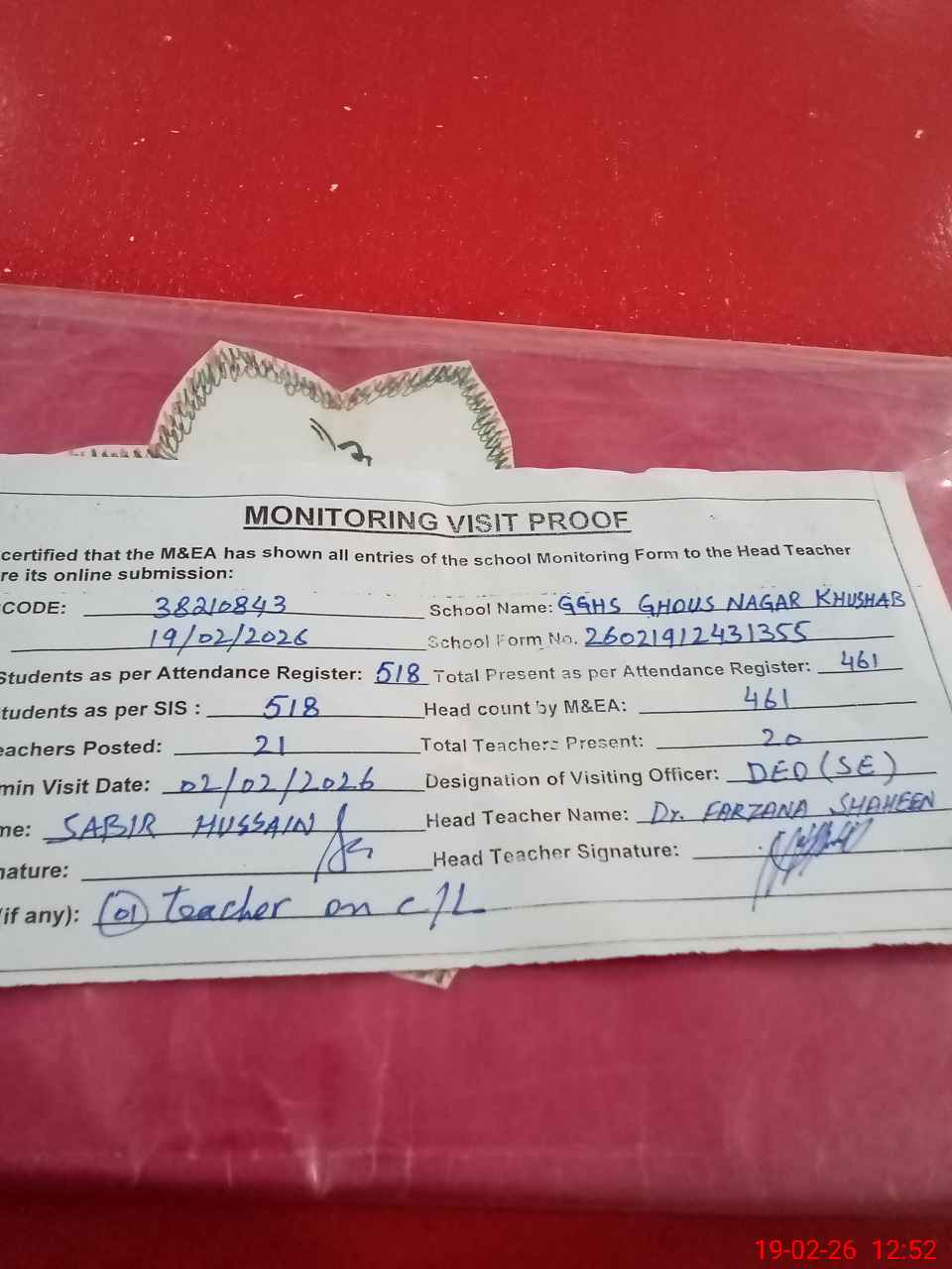 | EMIS Code: 38210843 | Name of School: GGHS GHOUS NAGAR KHUSHAB | |||