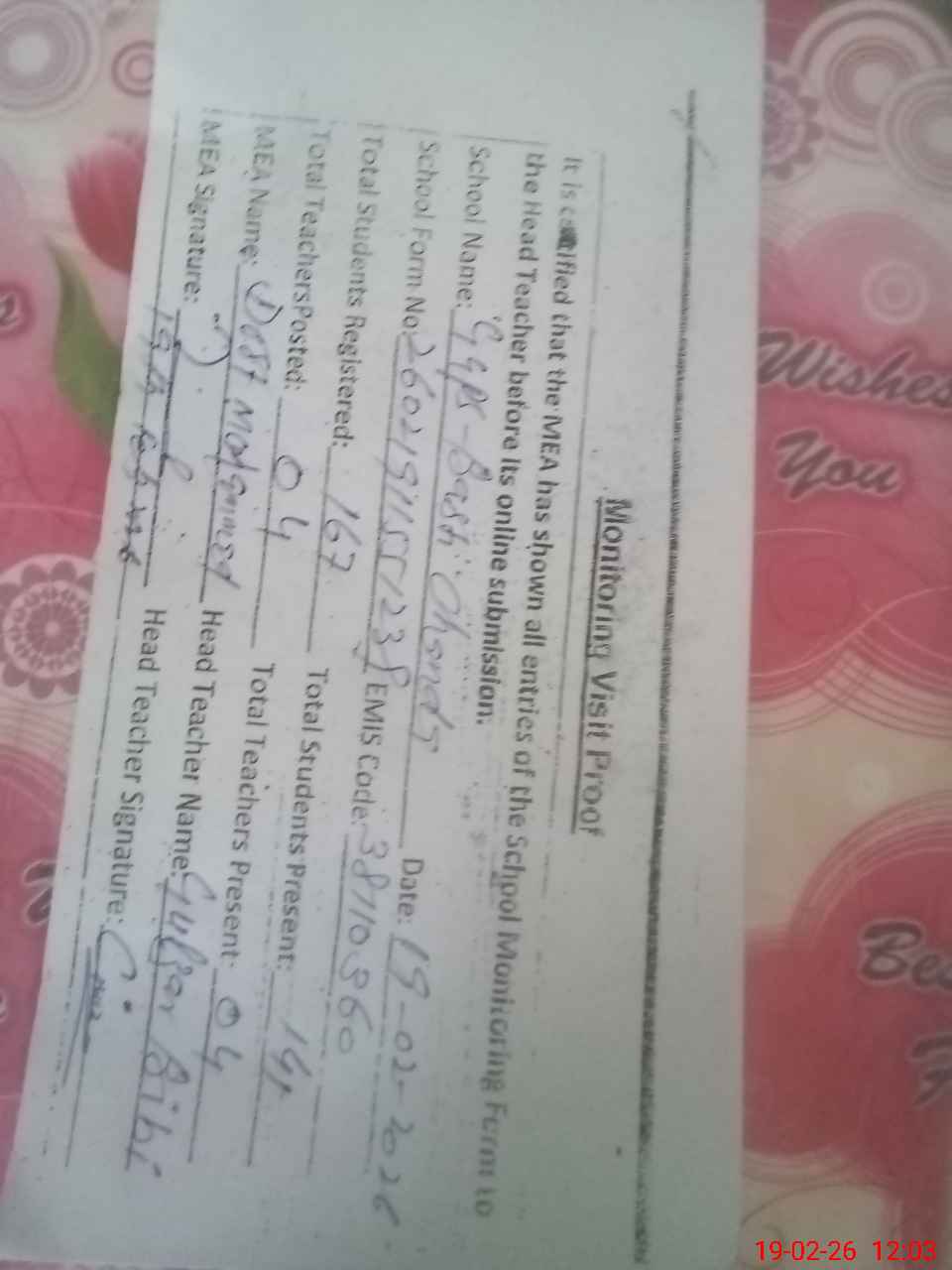 | Remarks (Use Separate Page if Required): All the entered data loudly share with the head teacher before submitting | |||||