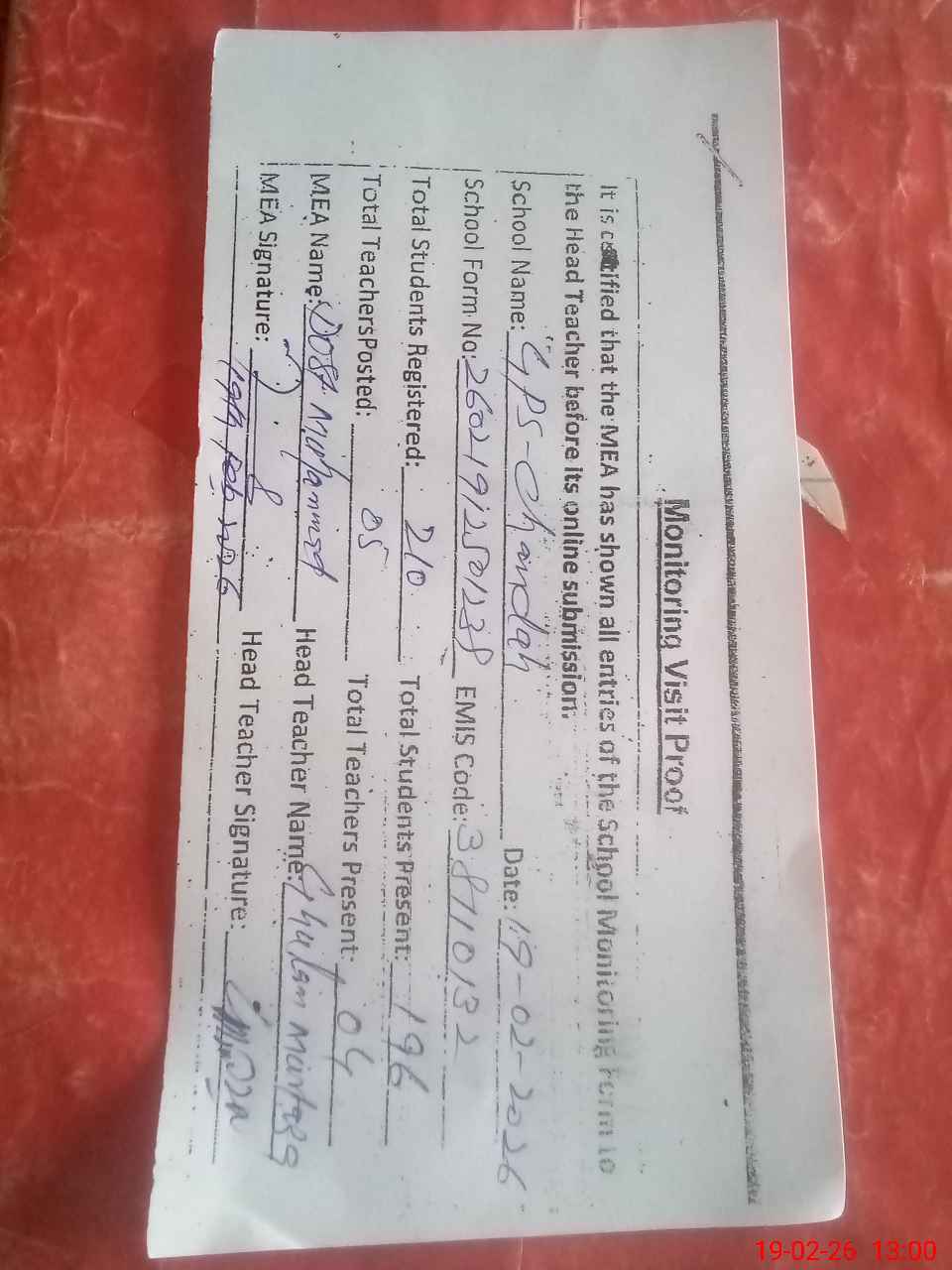 | Attendance Register | Head Teacher | MEA with School | Visit Proof |