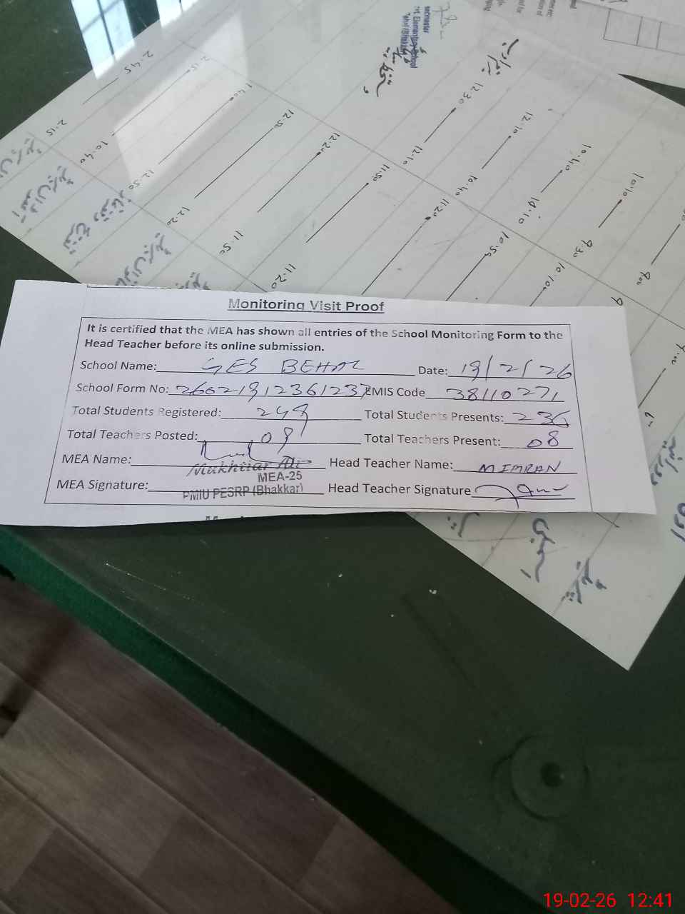 | Certified that this School was Inspected by the Undersigned MEA/DMO Today and the Information Stated Above is as Per Record. | |||||