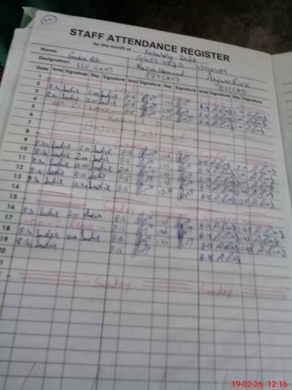 | CNIC | Full Name | Designation | R/C | Absence During Last Calender Month |