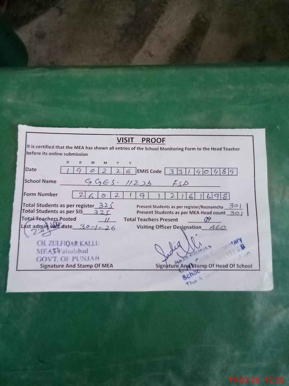 | Attendance Register | Head Teacher | MEA with School | Visit Proof |