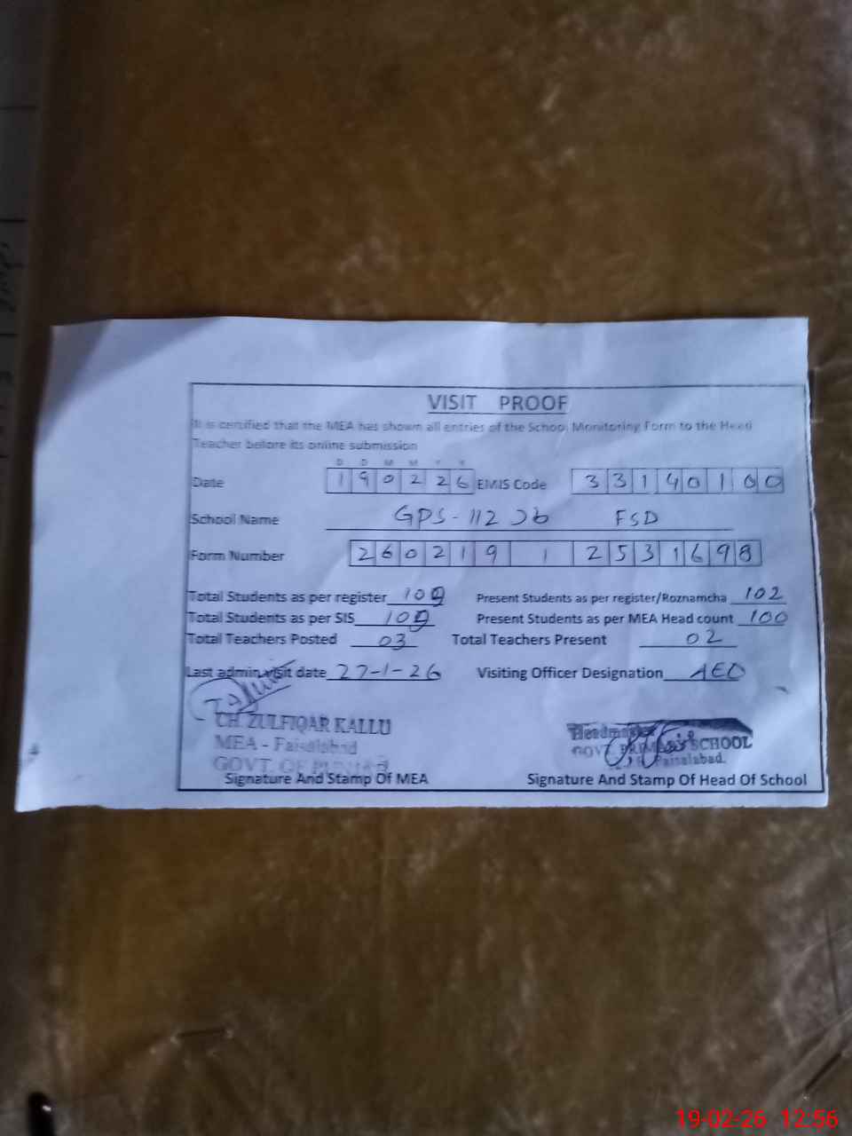 | Attendance Register | Head Teacher | MEA with School | Visit Proof |