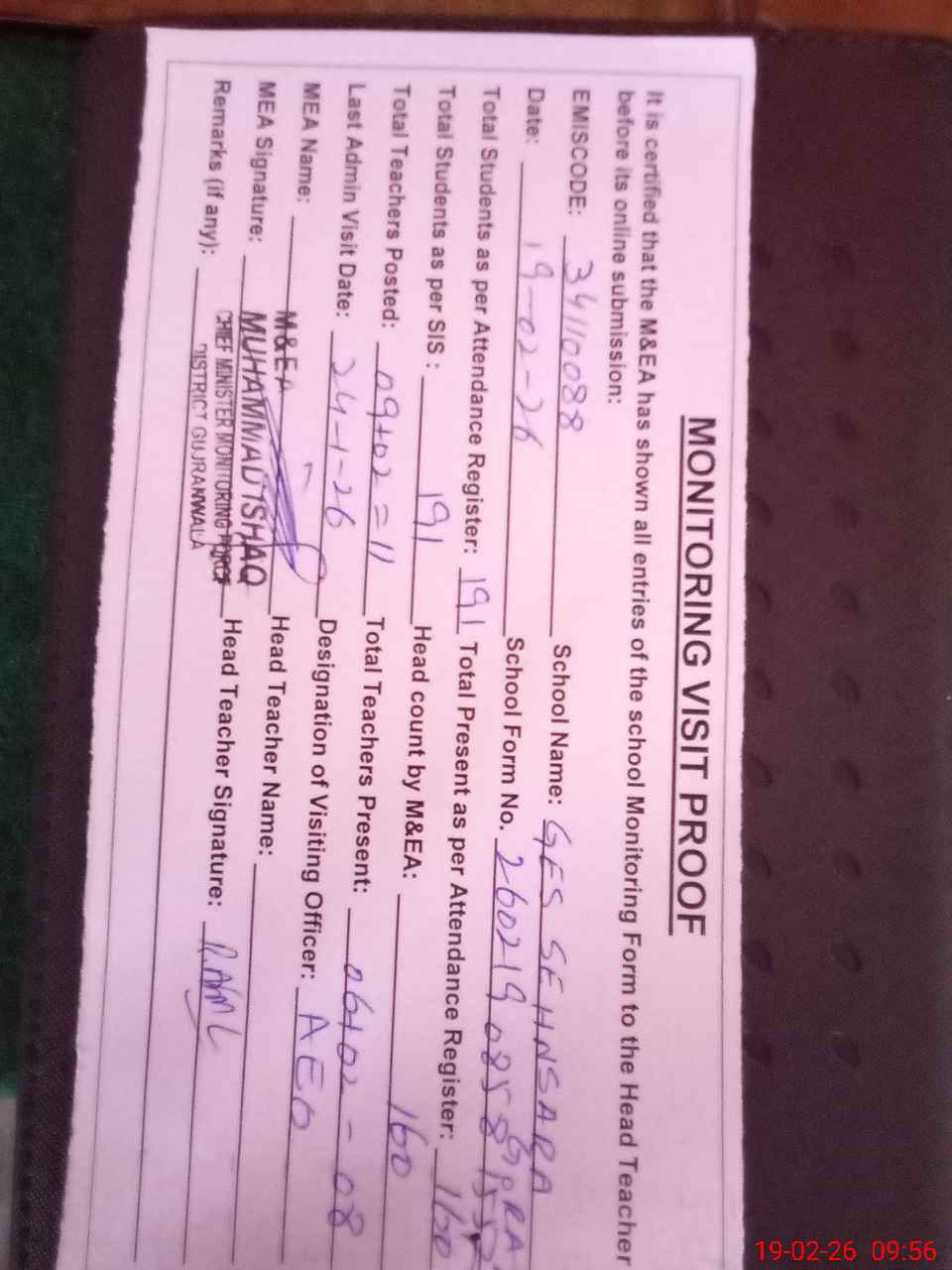 | Attendance Register | Head Teacher | MEA with School | Visit Proof |