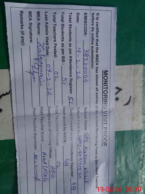 | EMIS Code: 38220044 | Name of School: GPS EASAN KHAIL | |||