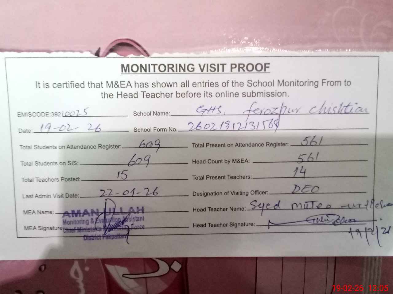 | EMIS Code: 39210025 | Name of School: GHS FEROZPUR CHISHTIAN | |||