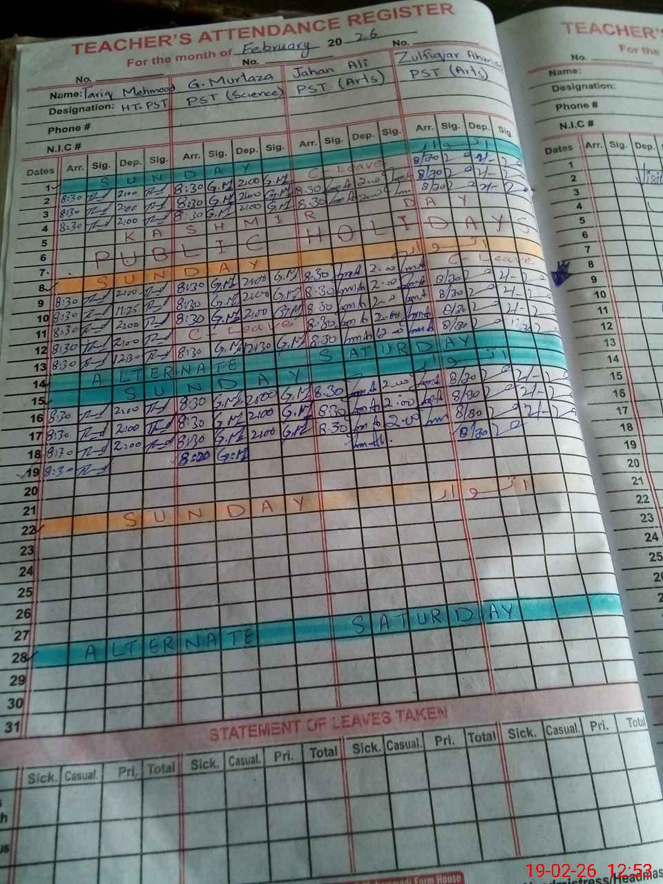 | CNIC | Full Name | Designation | R/C | Absence During Last Calender Month |