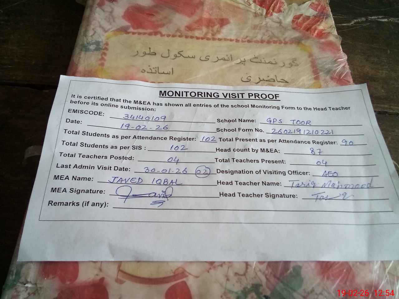 | Attendance Register | Head Teacher | MEA with School | Visit Proof |