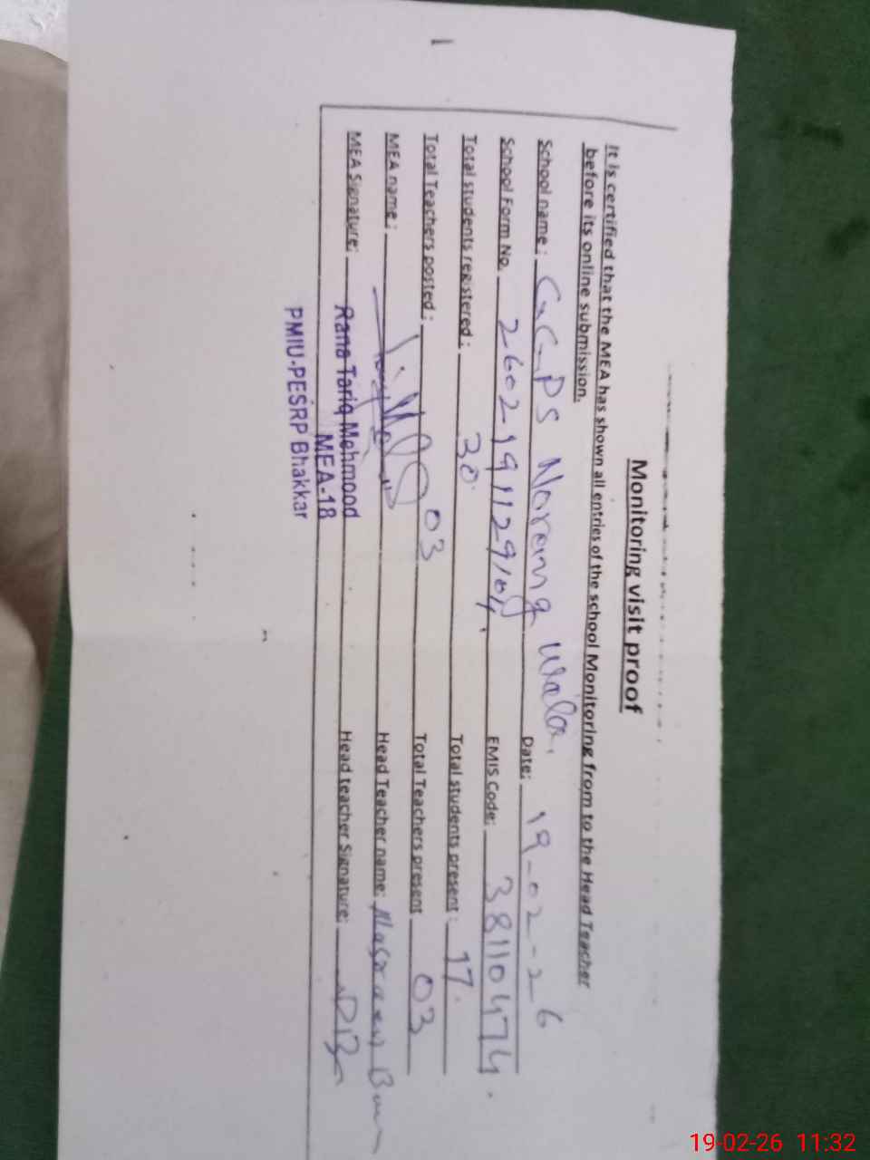 | Certified that this School was Inspected by the Undersigned MEA/DMO Today and the Information Stated Above is as Per Record. | |||||