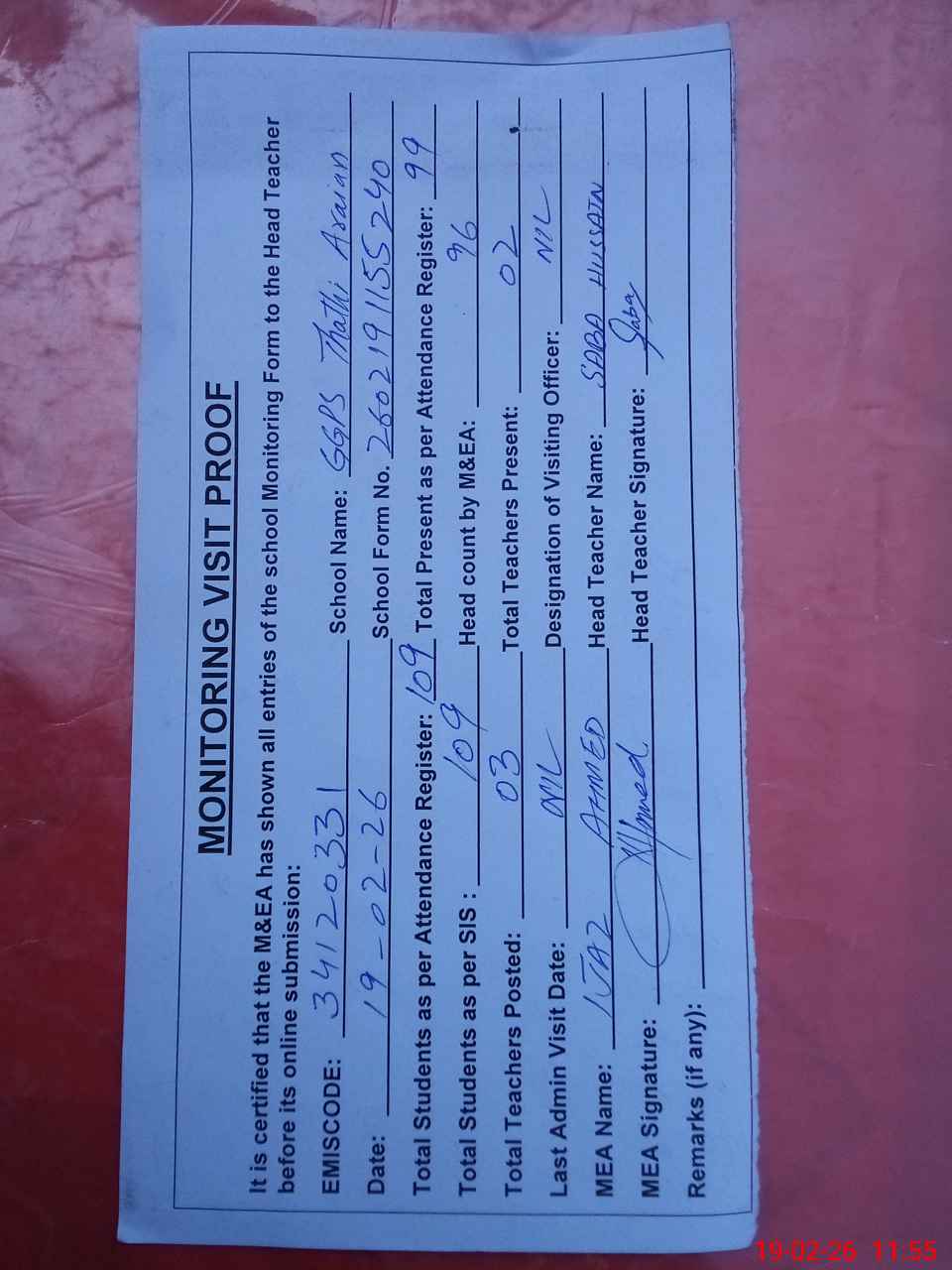 | Attendance Register | Head Teacher | MEA with School | Visit Proof |