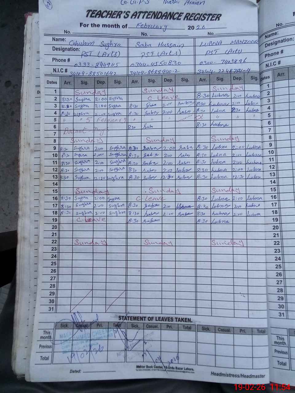 | CNIC | Full Name | Designation | R/C | Absence During Last Calender Month |