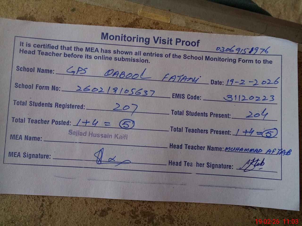 | Attendance Register | Head Teacher | MEA with School | Visit Proof |